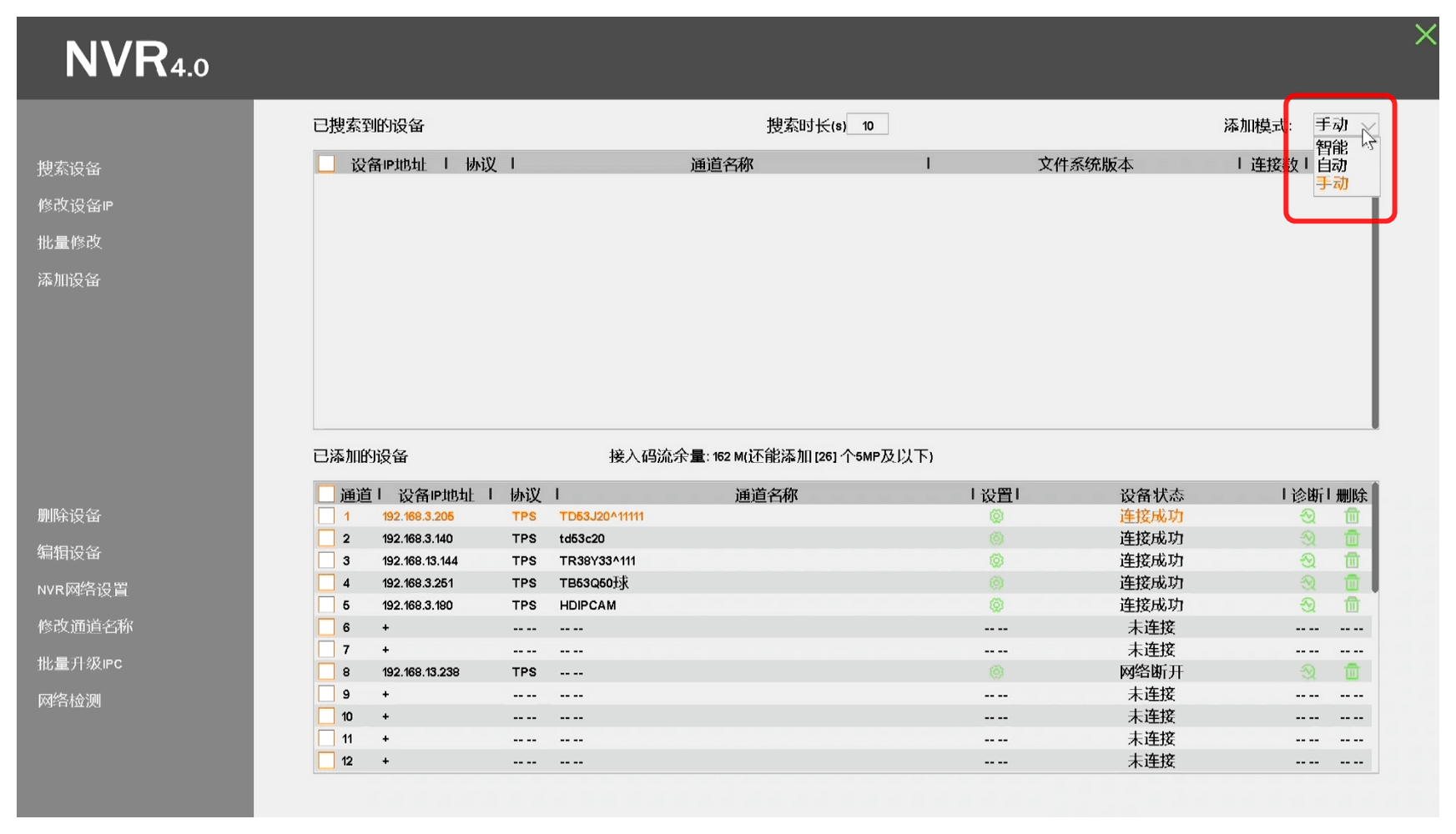 您好,如NVR上--视频管理--添加模式不能切换手动或自动/智能模式,原因是因为NVR主机上“关闭所有智能修改”被启用(图标绿色),锁定参数导致不能切换添加模式,把“关闭所有智能修改”改为禁用(图标灰色);