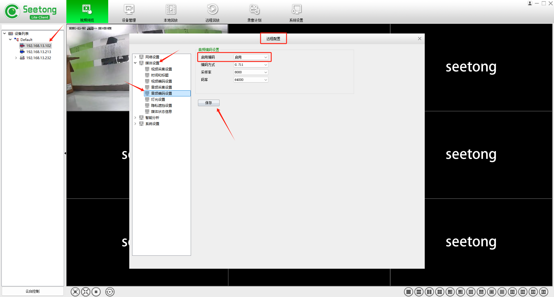 您好,若单个摄像头需要启用/禁用音频编码,可在电脑端本地登录连接成功设备后,在视频预览页面鼠标右键点击该设备,远程配置——媒体配置——音频编码设置——启用编码,根据需求选择启用/禁用后点击保存即可。